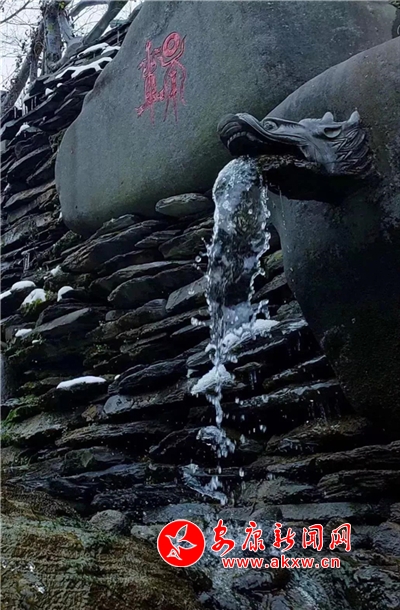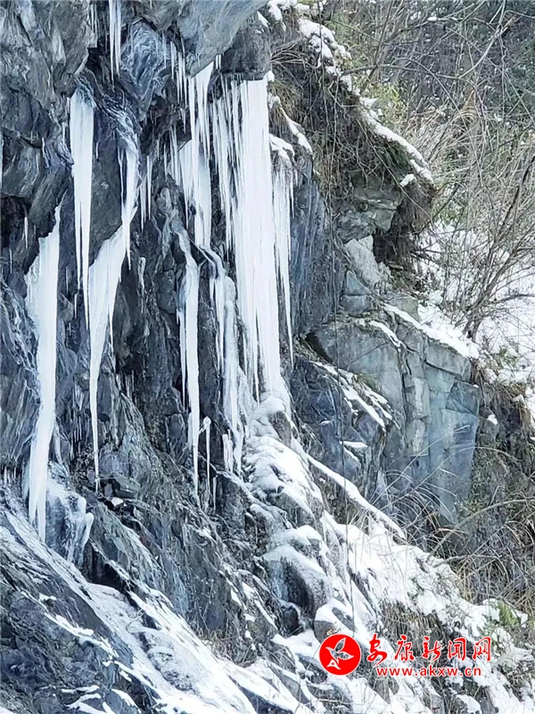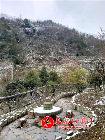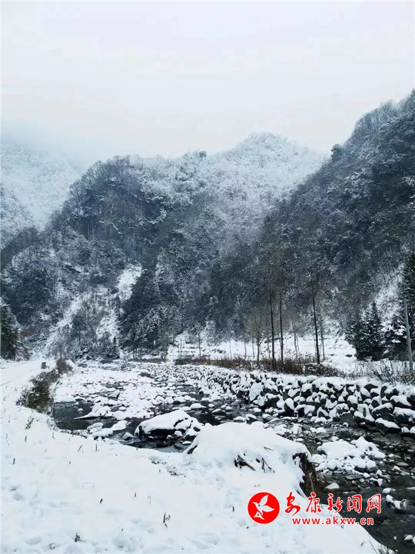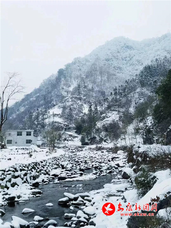 愈往深山走去,愈是銀裝素裹。發(fā)如雪,天作襯。色彩在這里失去了顏色,整個(gè)世界只剩下黑與白的構(gòu)圖。山澗中露出的黑巖,連綿著,將青絲的線條起伏蜿蜒地勾勒而出。山腳下一排排整齊的村民安置房,已顯出冬眠酣睡的樣子。樹(shù)林里帶著一層朦朧,在群山連綿中起伏著,為這雪天獻(xiàn)上了一幅絕美的水墨畫卷,也更增加了幾分神秘。