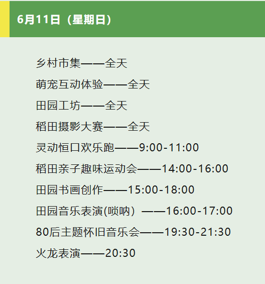 當(dāng)日,現(xiàn)場還舉辦了稻田拔河、稻田摸魚、稻田摔跤等娛樂活動和田園古箏表演、70后主題懷舊音樂會、火龍表演等演出活動,吸引眾多游客朋友前來打卡。6月11日,靈動恒口歡樂跑、親子趣味運(yùn)動會、嗩吶音樂表演、80后主題懷音樂會等活動精彩繼續(xù)......?
