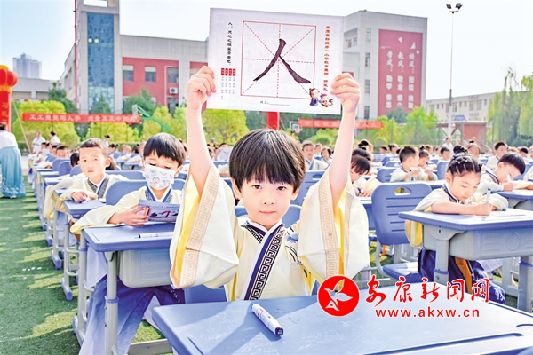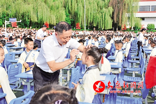 為傳承中國傳統(tǒng)文化,進一步加強學(xué)生文明禮儀教育,日前,安康高新區(qū)第一小學(xué)舉行一年級新生開筆禮及優(yōu)秀學(xué)生表彰活動。千名一年級蒙童身著漢服,由班主任帶領(lǐng)跨過啟蒙門,正衣冠、感恩鞠躬、朱砂啟智、擊鼓明志、開筆啟蒙,接受中國傳統(tǒng)文化的洗禮,領(lǐng)略傳統(tǒng)文化的魅力。(張凌云 攝)