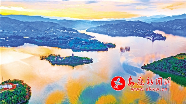 安康位于漢江中上游,秦嶺以南,巴山以北,漢江穿境而過。近日的安康瀛湖,色彩斑斕、美麗如畫,特別是在夕陽西下和旭日初升的時候,格外美麗,如一幅巨大的山水畫鑲嵌在群山懷抱之中,引人入勝。 趙華斌 攝?