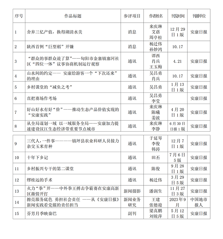 經(jīng)過1月30日編委會(huì)推薦、社黨委研究決定,擬推薦以下15件新聞作品參評(píng)2023年度“陜西新聞獎(jiǎng)”。公示時(shí)間從2024年1月31日至2024年2月5日,公示期為5個(gè)工作日。如有不同意見,請(qǐng)向安康日?qǐng)?bào)社機(jī)關(guān)紀(jì)委、新聞管理部反映。