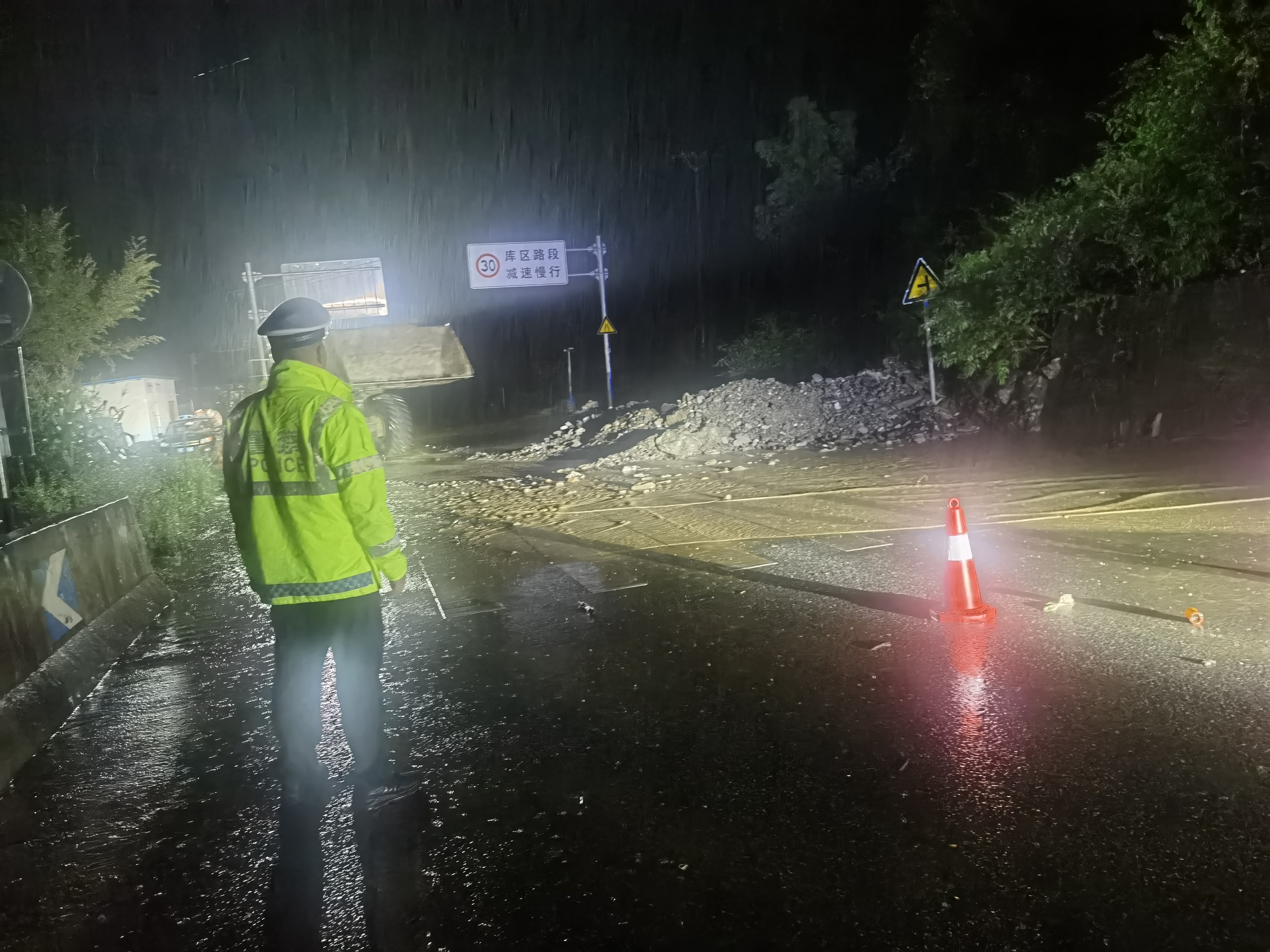 旬陽市公安交警持續(xù)堅守防汛一線,無畏風(fēng)雨、無懼危險,開展交通管控、救援救助、應(yīng)急處突、隱患排除等相關(guān)工作,全力保障人民群眾生命財產(chǎn)安全。暴雨中,交警身著熒光綠雨衣,不畏風(fēng)雨,堅守在重要路段,對有滑坡、落石等危險路段及具有安全風(fēng)險的臨水臨崖路段,采取臨時禁行的管制措施,引導(dǎo)過往車輛繞行,注意行車安全,協(xié)同相關(guān)部門現(xiàn)場進行清理,對不能現(xiàn)場處理的隱患及時上報,確保排險不留盲點、隱患不留死角。同時加強道路的巡邏管控,通過遠(yuǎn)端分流,引導(dǎo)車輛、行人安全有序通行,確保群眾出行安全。以雨為令,以夜為伴,逆風(fēng)而行,通宵達旦,風(fēng)雨中,一抹抹“熒光綠”在熠熠閃光。