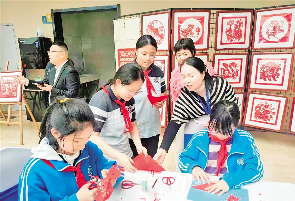 走進(jìn)張莉的課堂里,滿目色彩繽紛的剪紙作品,大大小小地陳列在展臺(tái)處。整整齊齊的桌凳圍成一個(gè)個(gè)不同形狀,以便于學(xué)生更好地進(jìn)行交流。她用學(xué)生通俗易懂的語言為學(xué)生傳授剪紙技巧:“同學(xué)們,我們首先把需要用的彩紙對折接著裁剪出合適的大小。然后再描出自己想要剪出的形狀……”通過紙張?jiān)谥讣鈦砘胤D(zhuǎn),手中的剪刀“咔嚓咔嚓”,一幅幅美輪美奐的作品便呈現(xiàn)在眼前。每周張莉都要給學(xué)生們上幾節(jié)美術(shù)課,這也讓很多學(xué)生對剪紙產(chǎn)生了濃厚的興趣,創(chuàng)造出很多優(yōu)秀作品。