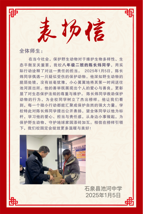陳長(zhǎng)煒的暖心事跡傳到學(xué)校后,學(xué)校發(fā)布了表?yè)P(yáng)信,公開(kāi)表?yè)P(yáng)陳長(zhǎng)煒同學(xué)的愛(ài)心善舉和保護(hù)野生動(dòng)物的暖心行為。號(hào)召全體學(xué)生要學(xué)習(xí)陳長(zhǎng)煒的愛(ài)心、責(zé)任和擔(dān)當(dāng),從小事做起,從自身做起,保護(hù)野生動(dòng)植物,為保護(hù)地球家園、尊重生態(tài)文明的多樣性貢獻(xiàn)力量。?