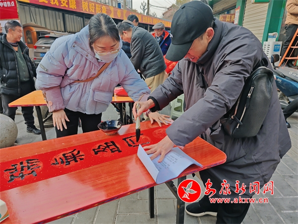義寫現(xiàn)場(chǎng),10余位書法家們凝神提筆,為社區(qū)群眾潑墨獻(xiàn)藝,楷書、行書、隸書等各種字體躍然紙上。“一帆風(fēng)順年年好,萬事如意步步高”“蛇舞春風(fēng)傳喜訊,燕歸故里報(bào)佳音”等一副副寓意吉祥的春聯(lián)在筆下完成,一副副精心創(chuàng)作的年畫躍然紙上,令人賞心悅目,更有書法愛好者踴躍加入,與老師們互動(dòng)交流。社區(qū)的紅馬甲志愿者忙碌著分發(fā)、晾曬春聯(lián),聞?dòng)嵍鴣淼娜罕娊j(luò)繹不絕,大家拿著手寫的春聯(lián)和年畫,喜悅之情溢于言表。本次活動(dòng)共書寫對(duì)聯(lián)300余副,“福”字200余張,送出國畫作品40余幅。