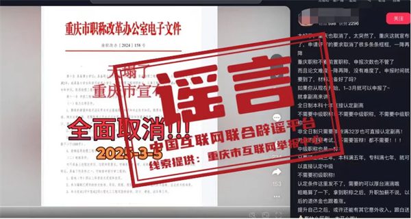 真相:近日,有網(wǎng)民在互聯(lián)網(wǎng)平臺發(fā)布消息稱“重慶市宣布,申請?jiān)u審的要求取消了很多條條框框,職稱申請不看前置職稱,全日制本科十年直接認(rèn)定副高,不需要中級職稱”,引發(fā)關(guān)注。經(jīng)核實(shí),網(wǎng)傳信息系謠言。職稱評審均需逐級晉升,取得上一級職稱并滿足相應(yīng)學(xué)歷資歷條件后方可晉升高一級職稱。目前重慶市除特殊人才、博士后等3個(gè)針對特定對象的職稱申報(bào)綠色通道外,正常申報(bào)通道均需逐級晉升。網(wǎng)傳文件是網(wǎng)民通過P圖軟件編輯而成,試圖吸引不明真相的群眾咨詢,借機(jī)推銷職稱代辦服務(wù),收取高額費(fèi)用。目前,謠言線索已轉(zhuǎn)交公安機(jī)關(guān)進(jìn)一步調(diào)查處置。(來源:“重慶辟謠”微信公眾號)