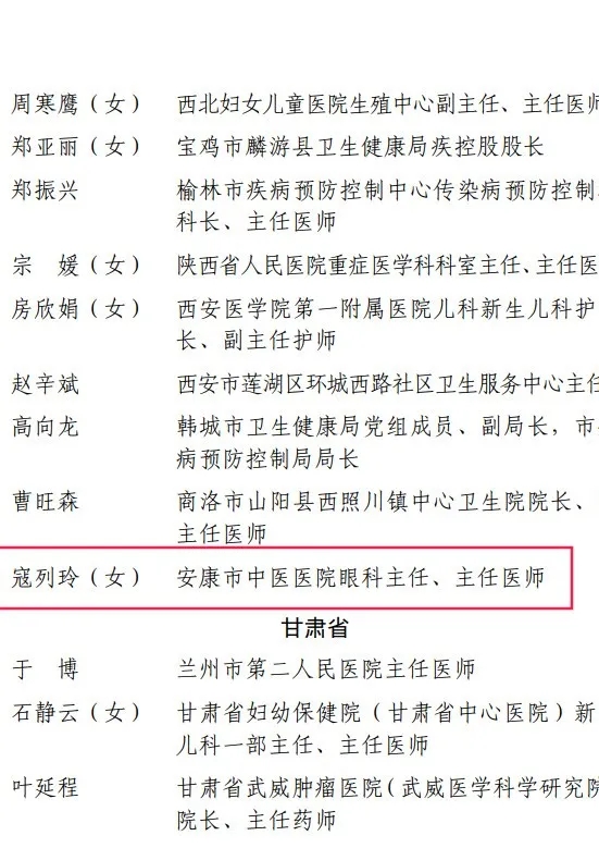 寇列玲,女,漢族,1975年10月生,陜西黃陵人,中共黨員,主任醫(yī)師,現(xiàn)任安康市中醫(yī)醫(yī)院眼科主任。該同志醫(yī)術精湛,服務患者耐心細致,心系社會,開展近視防控公益行進校園100余次,行程20萬公里,篩查學生10余萬人,受益學生50余萬人,解除安康山區(qū)數(shù)以萬計眼病患者痛苦,避免因盲致貧、因殘致貧。帶領眼科團隊銳意進取,眼科入選國家區(qū)域診療中心培育單位、國家中醫(yī)優(yōu)勢??平ㄔO項目、陜西省區(qū)域診療中心。參與國家中醫(yī)藥管理局《前部缺血性視神經病變》臨床指南制修訂,完成省中醫(yī)藥管理局十大病種《玻璃體積血》《消渴目病》創(chuàng)新項目,取得陜西省科技成果三等獎2項,被評為安康市第四屆十佳醫(yī)生稱號,榮獲安康市十佳科技青年獎,被評為安康市有突出貢獻專家,入選“西部之光”訪問學者。
