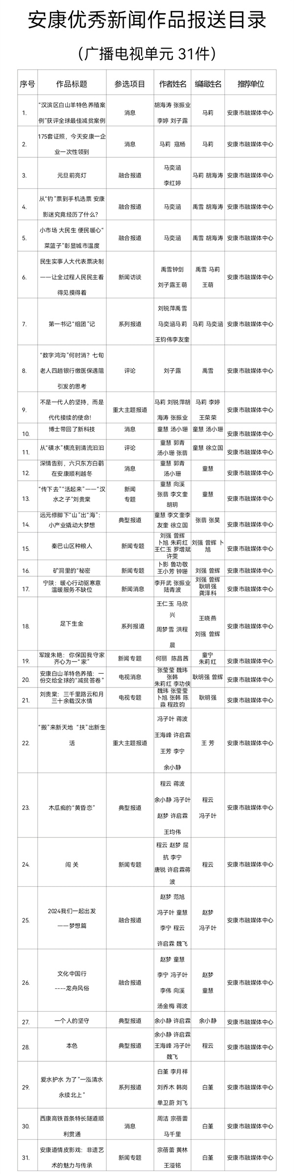 根據(jù)《關(guān)于開展2024年度安康優(yōu)秀新聞作品、安康市優(yōu)秀新聞工作者推選工作的通知》(安記協(xié)〔2025〕04號)文件要求,經(jīng)推薦、領(lǐng)導(dǎo)審核,安康市融媒體中心推薦參評2024年度安康優(yōu)秀新聞作品97件(報紙單元58件,廣播電視單元31件,新媒體單元8件)?,F(xiàn)將報送作品目錄(詳見附件)予以公示。