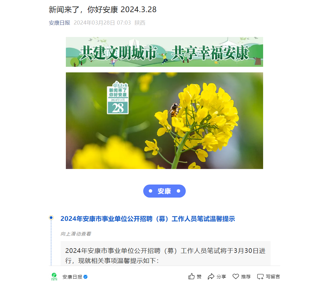 由安康日報社、安康新聞網(wǎng)運維的“安康發(fā)布”微信公眾平臺圍繞“聚焦重點政務(wù)新聞推送、深化政務(wù)公開、做好政策宣傳,助推政務(wù)服務(wù)”,著力打造政策宣傳、權(quán)威可信的內(nèi)容體系,整體傳播影響力、服務(wù)水平和引導(dǎo)能力不斷提升。累計推送推文900余期,推文1400余條,總閱讀次數(shù)95.8萬次。堅持民生視角,做強“服務(wù)力”,走好“網(wǎng)上群眾路線”,不斷深化完善“政務(wù)+服務(wù)”理念,圍繞就業(yè)就學(xué)、交通出行、重要天氣預(yù)報等民生消息,科學(xué)全面細(xì)致做好內(nèi)容發(fā)布。