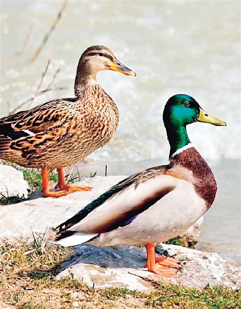 又名野鴨。雄鳥頭綠色,有一白色領(lǐng)環(huán),胸栗色,翼鏡藍綠色,尾上、下覆羽黑色,嘴黃綠色,腳橙紅色;雌鳥嘴橙黃色,貫眼紋黑褐色,全體褐色,有暗褐色斑紋。(來源:安康市林學會)