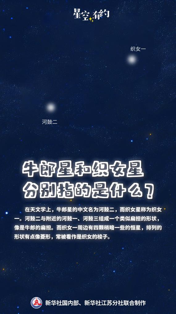 中國(guó)科學(xué)院紫金山天文臺(tái)科普主管王科超說(shuō),在天文學(xué)上,代表牛郎、織女的天體分別是牛郎星和織女星。牛郎星的中文名為河鼓二,織女星為織女一,它們分別是天鷹座和天琴座的亮星。河鼓二與附近的河鼓一、河鼓三組成一個(gè)類似扁擔(dān)的形狀,像是牛郎的扁擔(dān)。而織女一周邊有四顆稍暗一些的恒星,排列的形狀有點(diǎn)像菱形,常被看作是織女的梭子。