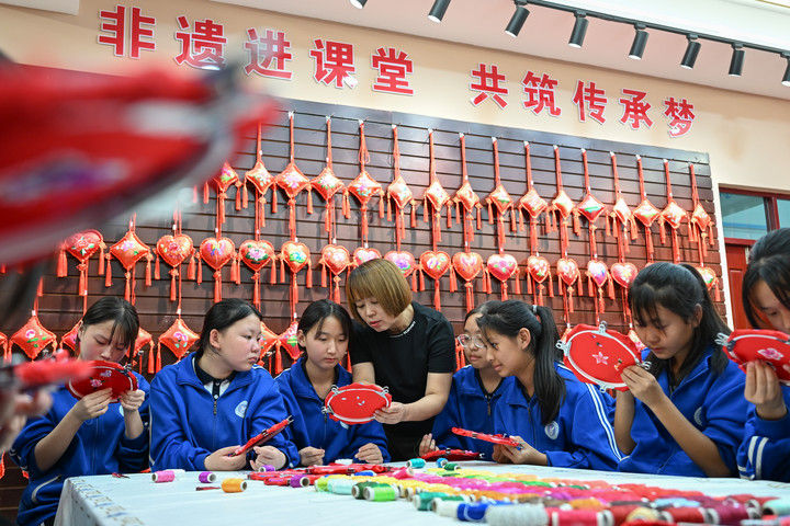 2025年9月26日,內(nèi)蒙古興安盟科右中旗巴彥呼舒第六中學(xué)美術(shù)教師、非遺代表性傳承人吳斯琴(左四)指導(dǎo)學(xué)生刺繡。近年來,內(nèi)蒙古興安盟科爾沁右翼中旗巴彥呼舒第六中學(xué)將當(dāng)?shù)貒壹?jí)非遺圖什業(yè)圖刺繡引入校園,開設(shè)校本課程,并成立興趣社團(tuán),在豐富校園文化生活的同時(shí),讓學(xué)生們近距離感受非遺的魅力,弘揚(yáng)和傳承中華優(yōu)秀傳統(tǒng)文化。