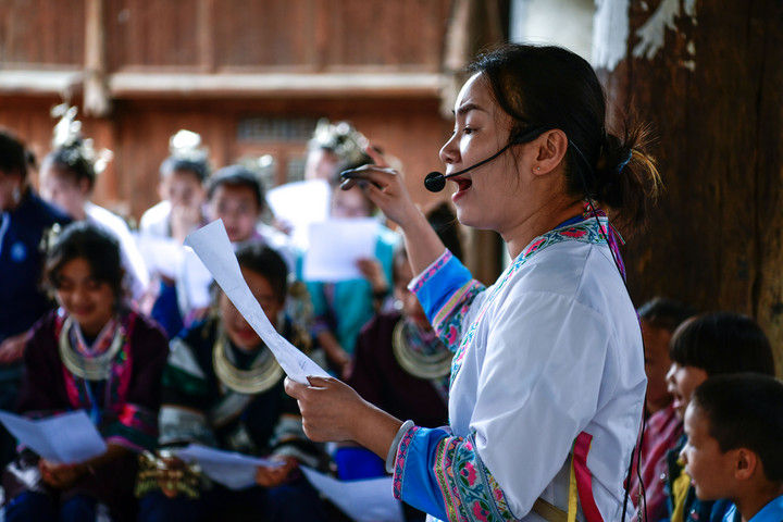 隨著國產(chǎn)動(dòng)畫電影《哪吒之魔童鬧海》不斷刷新中國影史票房紀(jì)錄,參與電影配樂的貴州省榕江縣三寶侗寨的楊想妮和“舞樂蟬歌”團(tuán)隊(duì)為更多人所熟知。樂團(tuán)成員懷揣“用音樂傳遞侗族文化,讓世界聽見侗族大歌”的共同夢(mèng)想,將侗族大歌推向更廣闊的舞臺(tái)。這是2025年4月22日,楊想妮在貴州省黎平縣肇興鎮(zhèn)廈格侗寨教前來研學(xué)的孩子們唱侗歌。