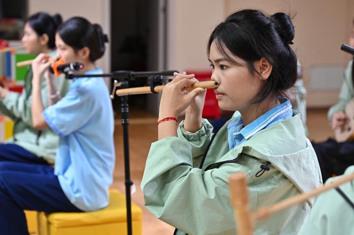 2025年6月12日,海南省民族技工學(xué)校學(xué)生在練習(xí)黎族鼻簫。近年來,海南省五指山市打造“非遺進(jìn)校園”工程,在14所公辦中小學(xué)開設(shè)非遺課程,培養(yǎng)青少年對(duì)中華優(yōu)秀傳統(tǒng)文化的熱愛,助力非遺傳承與發(fā)展。