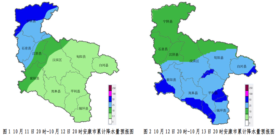 10月12日:全市大部陰天轉(zhuǎn)大雨(25~45毫米),紫陽(yáng)大部、嵐皋南部、平利中南部、鎮(zhèn)坪、漢濱南部、白河局地有暴雨(超過50毫米),過程期間局地伴有雨強(qiáng)超過10毫米/小時(shí)的強(qiáng)降水;
