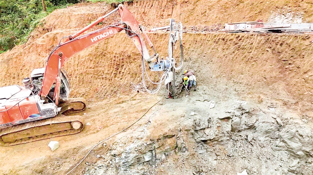 在鳳凰山隧道引線工程(進(jìn)口段)項(xiàng)目建設(shè)現(xiàn)場(chǎng),機(jī)器轟鳴,挖掘機(jī)揮舞著鏟斗挖掘土石,運(yùn)輸車輛往來(lái)穿梭,配合默契。工人們鉚足干勁,爭(zhēng)分奪秒搶抓工期,現(xiàn)場(chǎng)一派熱火朝天的施工景象。
