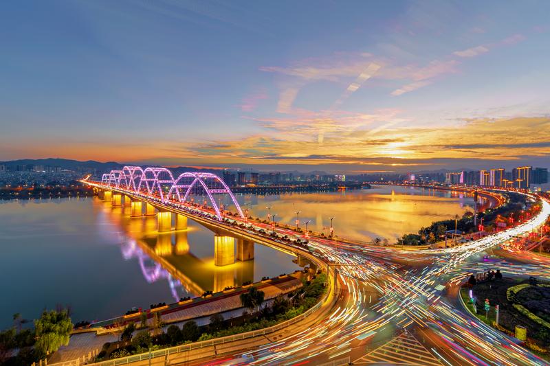 夕陽下的東壩漢江大橋流光溢彩。近年來,我市不斷優(yōu)化城市路網(wǎng),市民出行更加便捷,城市交通更加順暢。 皮勇維 攝