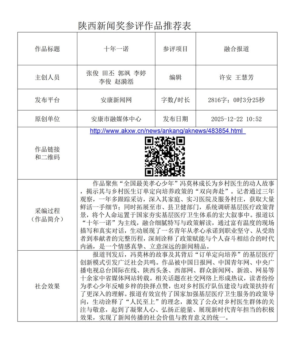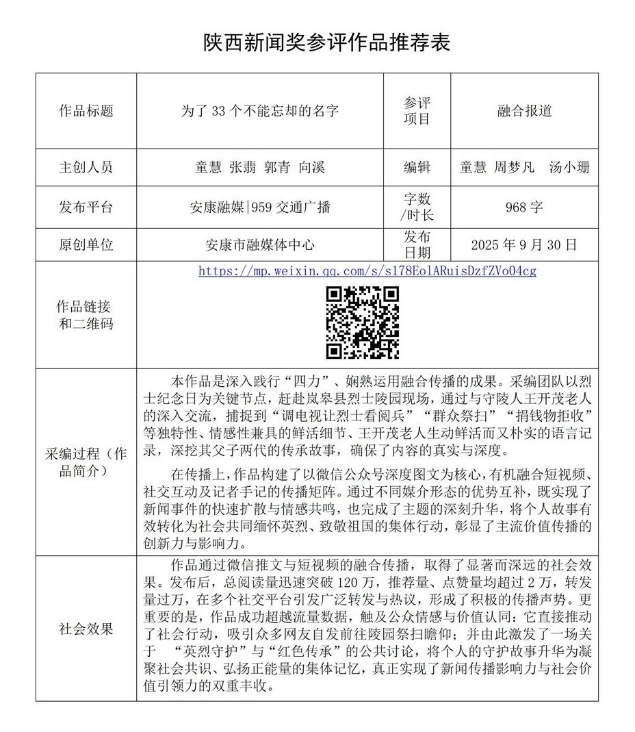 根據(jù)《陜西新聞獎、陜西省優(yōu)秀新聞工作者評選辦法》和《關(guān)于開展2025年度陜西新聞獎融合報道、應(yīng)用創(chuàng)新和新媒體新聞專欄作品推優(yōu)工作的通知》要求,經(jīng)個人申報、部門推薦和中心編委會嚴格篩選,對以下3件2025年度陜西新聞獎融合報道、應(yīng)用創(chuàng)新、新媒體新聞專欄參評作品進行公示。(作品推薦表附后)