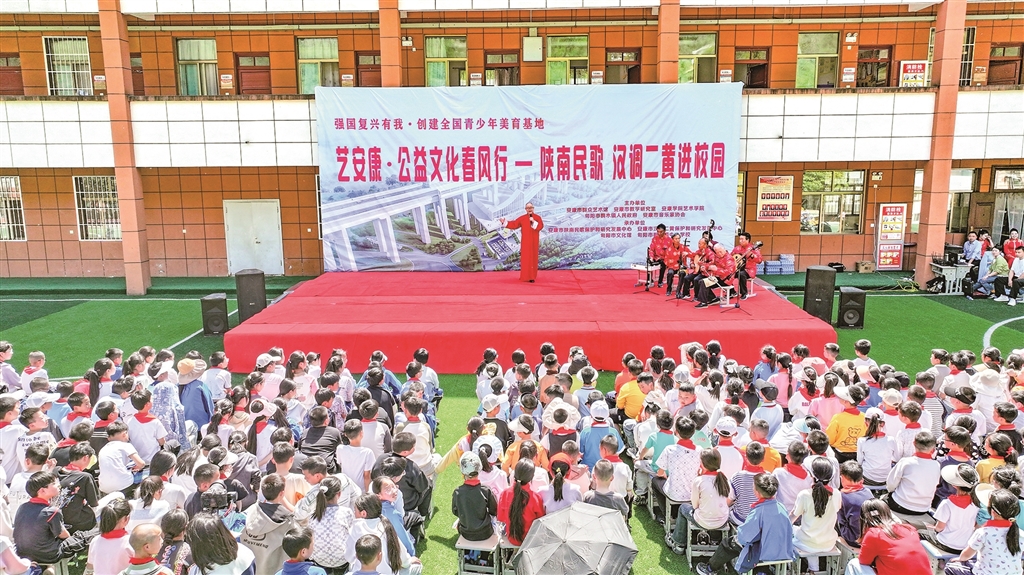 展演現(xiàn)場,紫陽小學學生帶來的民歌聯(lián)唱《童聲唱紫陽》贏得滿堂喝彩。孩子們用清亮的嗓音演繹《開山歌》《三月三上茶山》《螃蟹歌》等經(jīng)典陜南民歌,悠揚婉轉(zhuǎn)的旋律中透著童真童趣,將地域文化的獨特韻味展現(xiàn)得淋漓盡致?!斑@首歌是奶奶教我唱的,現(xiàn)在我在學校社團里學會了更多唱法?!敝鞒獙W生鄧可唯說,通過美育課程,她不僅學會了唱歌,還了解了民歌背后的民俗故事。