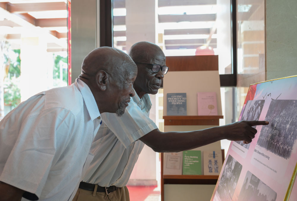 1月28日,在津巴布韋首都哈拉雷的中國大使館,兩名曾在中國接受培訓(xùn)的津巴布韋老戰(zhàn)士在展板老照片上尋找自己。當日,大使館舉行向津巴布韋解放斗爭老戰(zhàn)士轉(zhuǎn)交習(xí)近平主席復(fù)信活動。新華社記者 楊光 攝