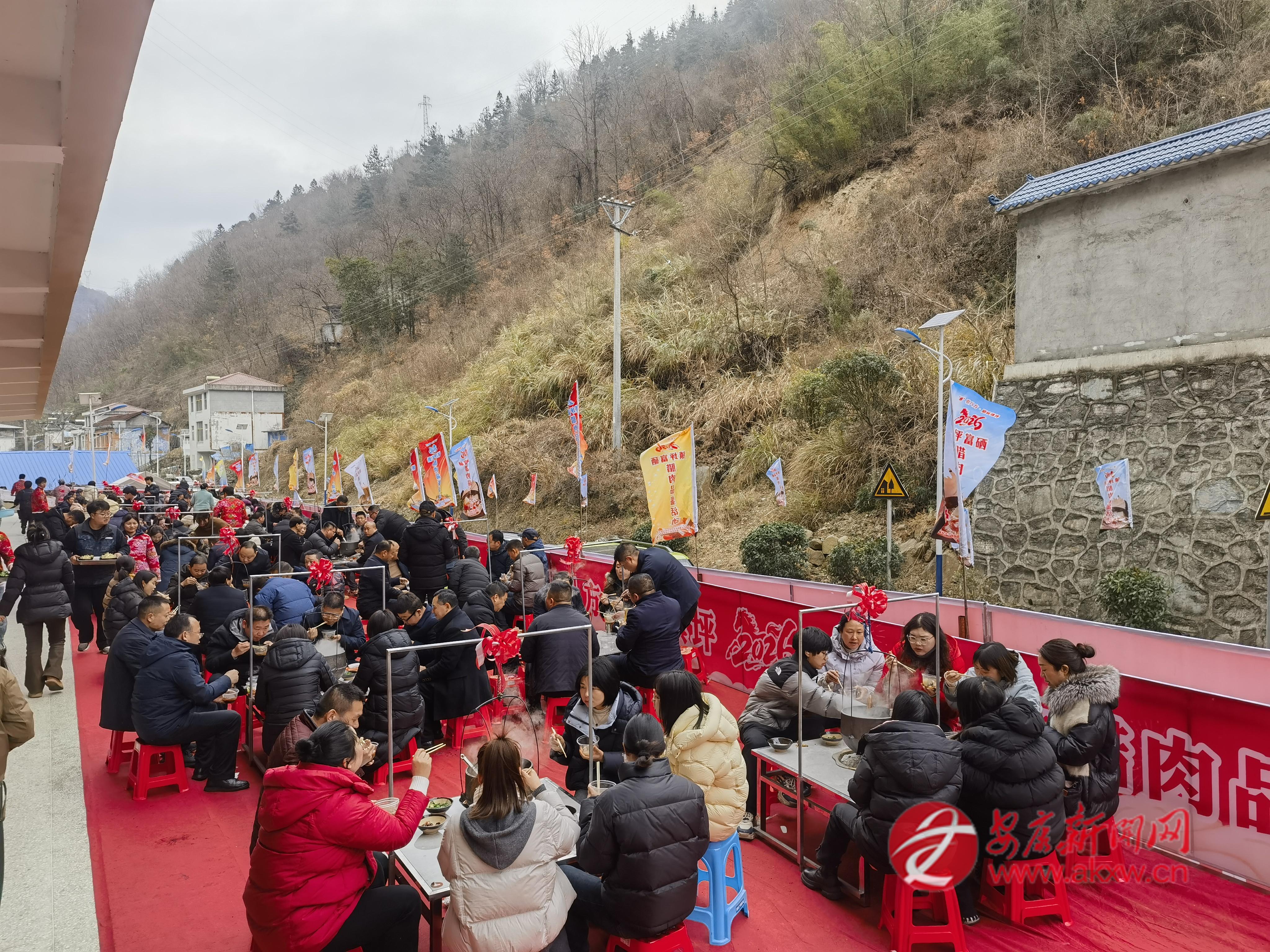 活動現(xiàn)場,一口巨型大鐵鍋格外引人注目,它可以燉500斤肉,可供1000人同時品嘗鎮(zhèn)坪富硒臘肉。同時,20個吊鍋中,臘肉與香菇、竹筍、干洋芋果果一同燉煮,香氣四溢,讓人垂涎欲滴。賓客們圍坐一起有說有笑,品嘗著可口地道的鎮(zhèn)坪臘肉,不僅是一場臘肉美食的集會,更是一種非遺技藝的傳承?!霸缇吐犝f陜南鎮(zhèn)坪的富硒臘肉有名,這次專程趕來,就為這一口地道的臘味,品嘗后覺得這臘肉的味道太美了!”在活動現(xiàn)場,一位來自西安的游客李先生在品嘗鎮(zhèn)坪臘肉后高興地說道。