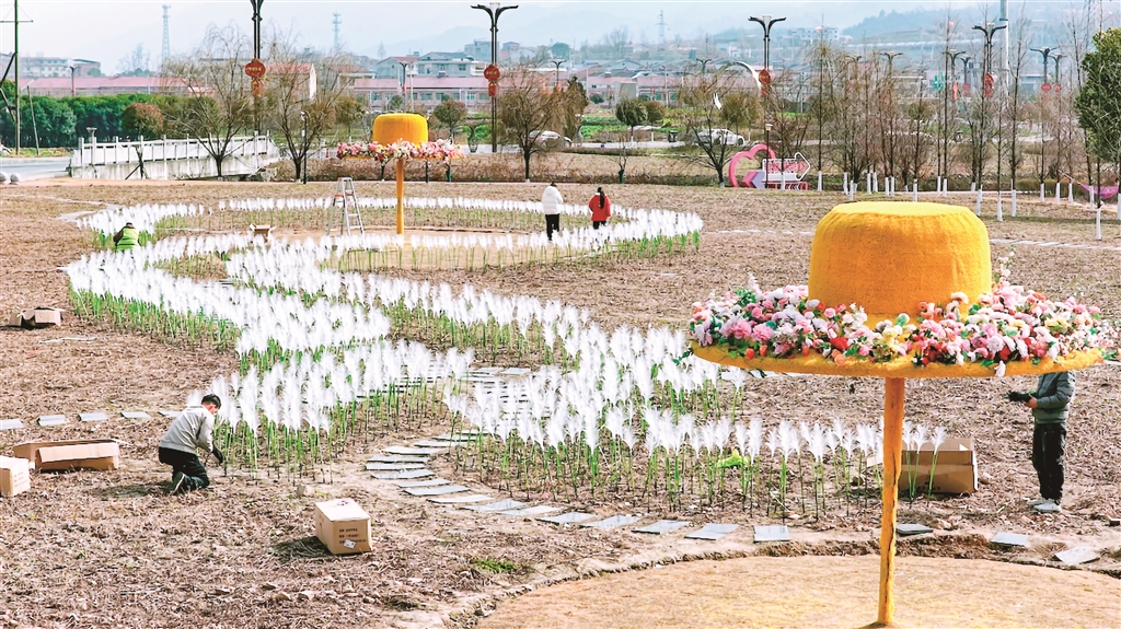 不遠(yuǎn)處的迎賓公園里,另一組工作人員正沿著步道和綠化帶安裝布置蘆葦燈帶。一根根蘆葦狀的燈桿錯(cuò)落豎立,待夜幕降臨時(shí),將勾勒出公園蜿蜒的輪廓,營(yíng)造出寧?kù)o溫馨的夜間景致。