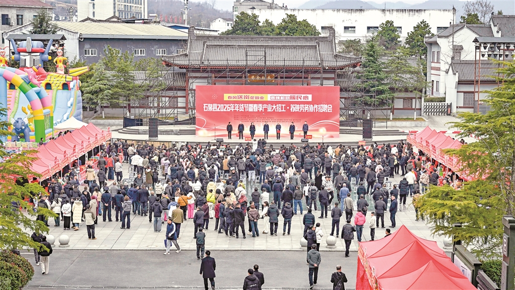 石泉縣2026年年貨節(jié)暨春季產(chǎn)業(yè)大招工·蘇陜勞務(wù)協(xié)作招聘會啟動儀式近日在秦巴風(fēng)情園舉行。本次活動創(chuàng)新融合“春風(fēng)行動”招聘會、年貨節(jié)與文旅促銷,吸引了縣內(nèi)外210余家重點企業(yè)參與,集中提供4500個優(yōu)質(zhì)崗位,旨在促進(jìn)就業(yè)與消費,助力縣域經(jīng)濟(jì)發(fā)展。(董長松 攝)