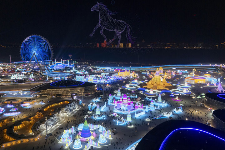 這是2026年1月5日拍攝的哈爾濱冰雪大世界園區(qū)的無人機(jī)表演(無人機(jī)照片)。新華社記者 張濤 攝