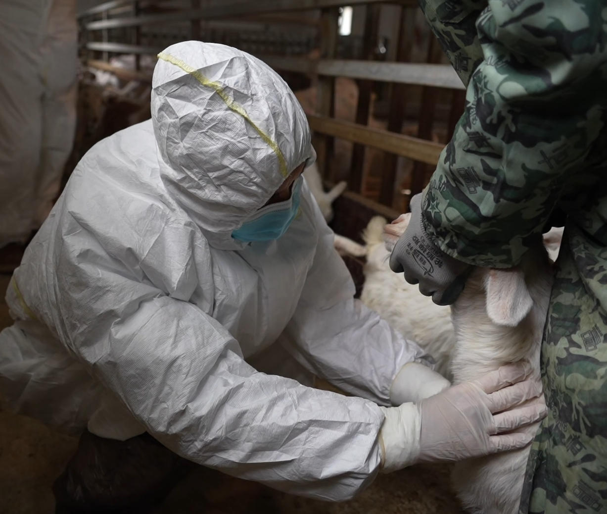 3月1日,在漢濱區(qū)關(guān)廟鎮(zhèn)唐淌村甲升興隆養(yǎng)殖合作社,畜牧獸醫(yī)師王峰身著白色防護服,蹲在羊圈邊,采集山羊血樣,為春季動物防疫工作“精準把脈”。