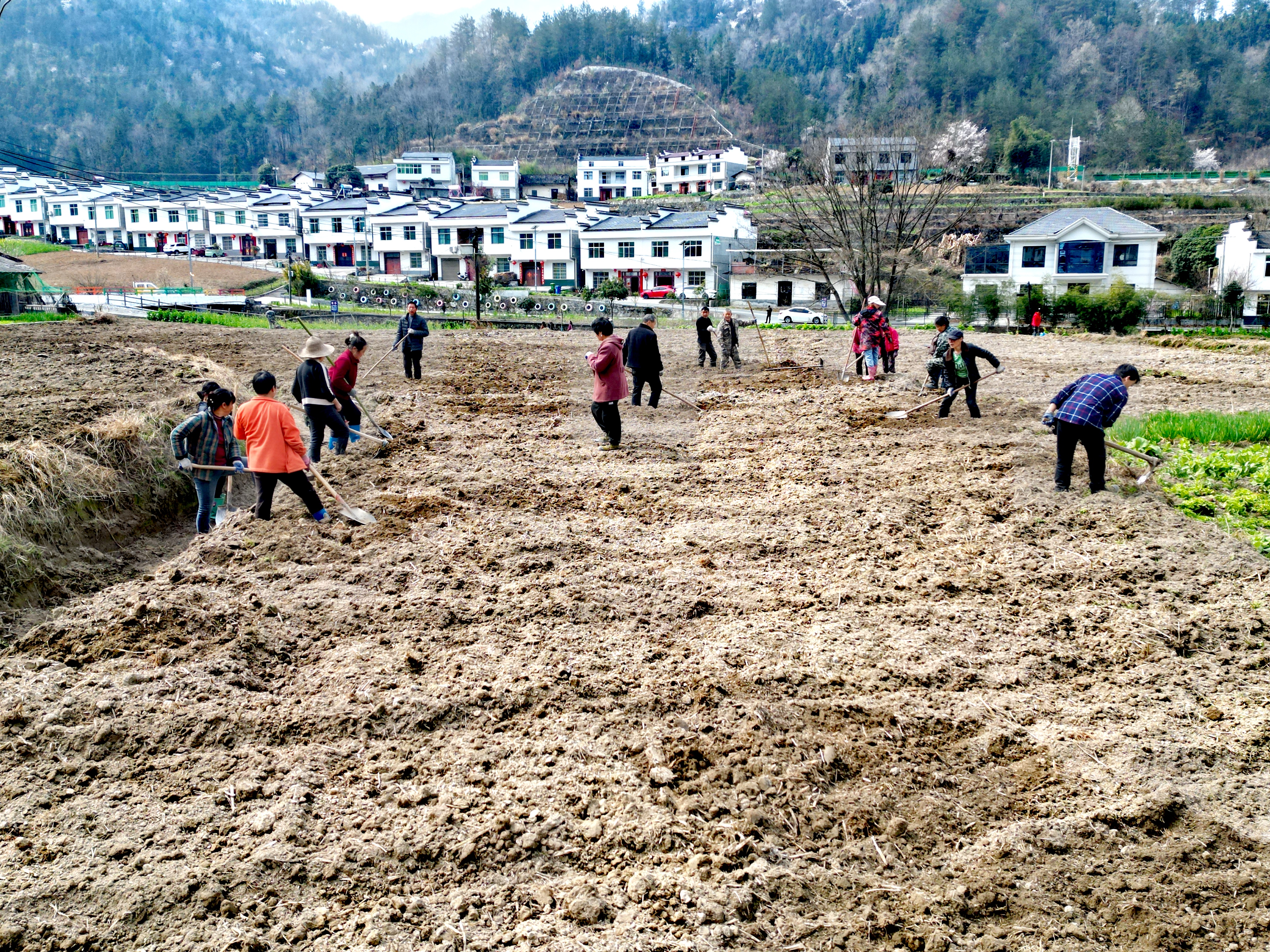 3月5日,走進(jìn)廣佛鎮(zhèn)八角廟村絞股藍(lán)基地?cái)U(kuò)建現(xiàn)場(chǎng),拖拉機(jī)在田間來(lái)回穿梭,有序開展翻耕、碎土、平整作業(yè);村民們緊隨其后,手持農(nóng)具整地、施肥、抽廂、打窩、播種、覆土,田間地頭一派如火如荼的春耕景象。