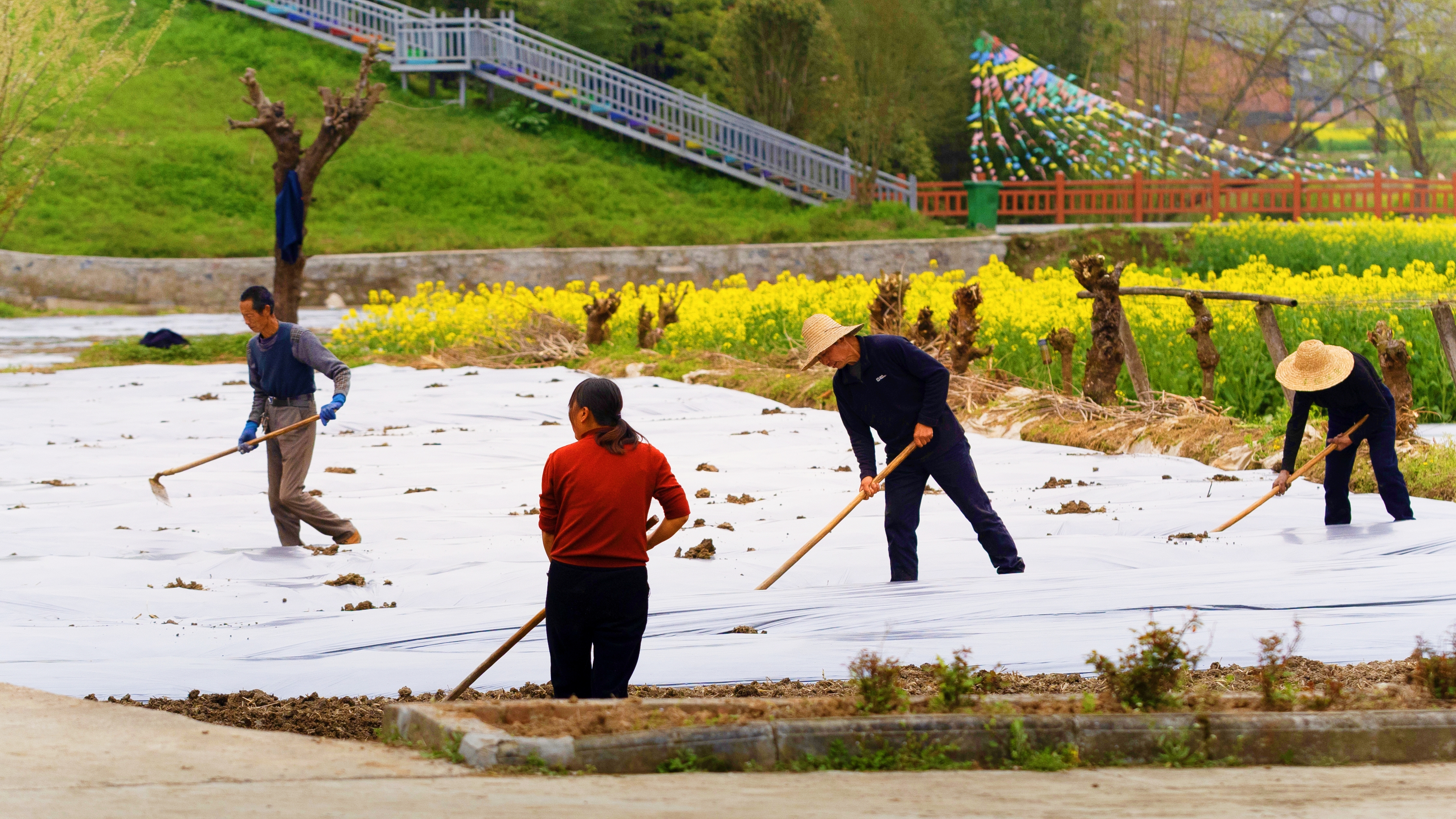 花海之上風(fēng)光旖旎,花海之下農(nóng)事正忙。趁著晴好天氣,當(dāng)?shù)剞r(nóng)戶搶抓春耕有利時(shí)節(jié),田間地頭一派熱火朝天的忙碌景象。大家分工協(xié)作、有條不紊,忙著起壟整地、鋪設(shè)地膜,為紫長(zhǎng)茄子移栽做前期準(zhǔn)備工作。