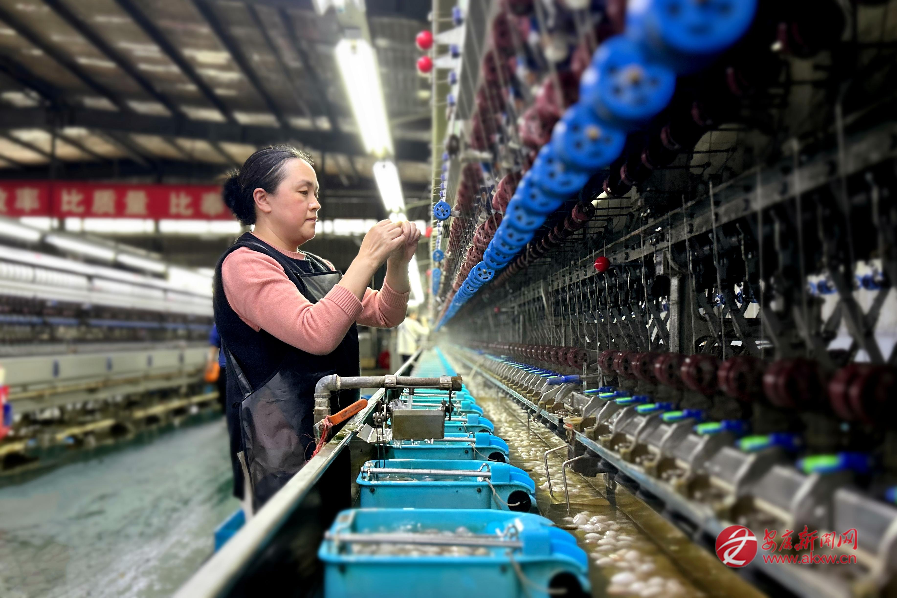 機(jī)器輕鳴如織,銀絲飛舞如虹。近日,陜西天成絲業(yè)有限公司繅絲車間內(nèi),女工徐小梅指尖靈動(dòng),于熱水中尋得絲頭,手腕輕揚(yáng)間,細(xì)如發(fā)絲的銀絲被穩(wěn)穩(wěn)抽起,化作連綿不斷的“軟黃金”。