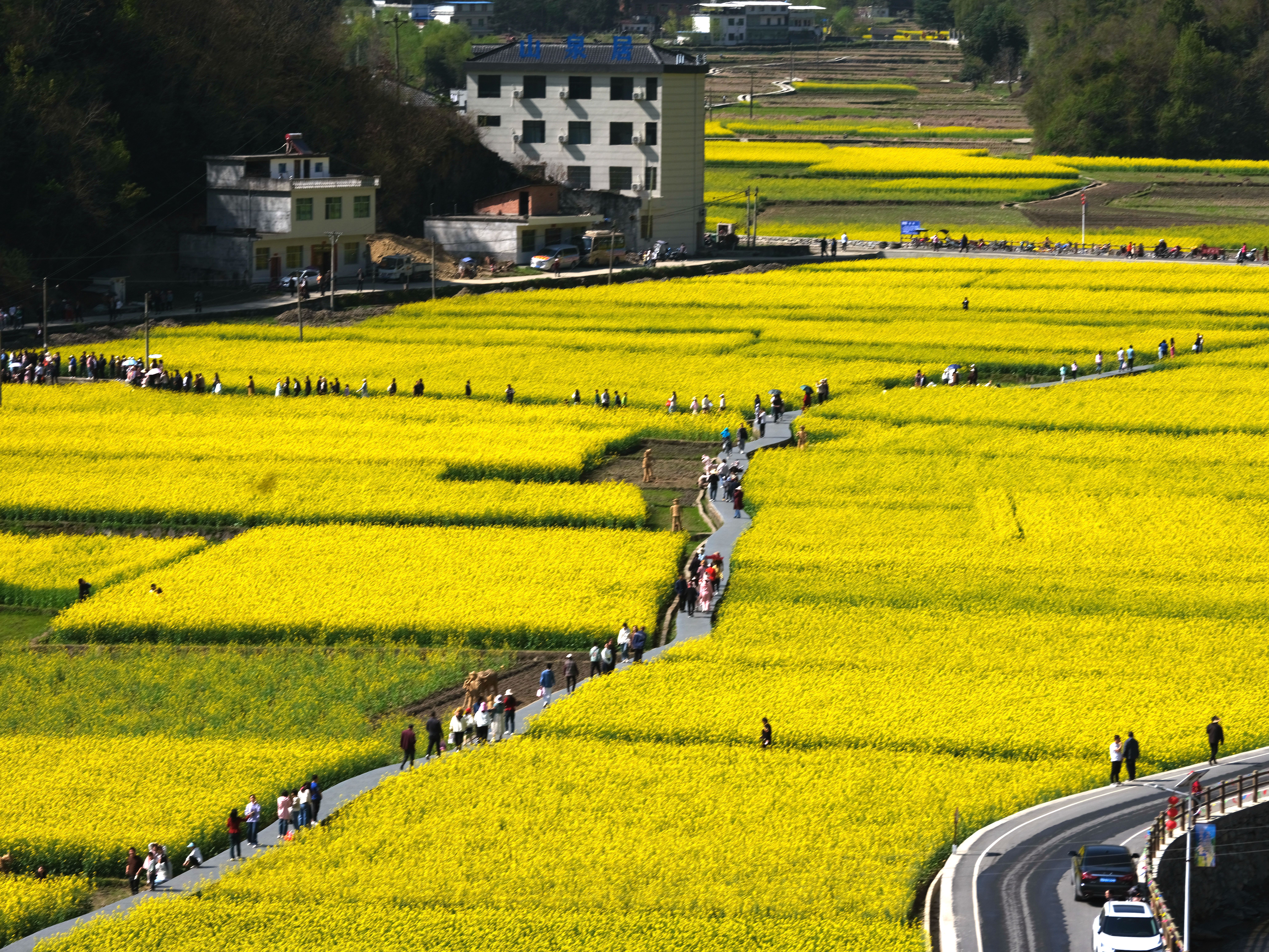 連日來,旬陽市仁河口鎮(zhèn)水泉坪3A級(jí)景區(qū)的近千畝油菜花競(jìng)相綻放,金黃色的花海鋪展如畫,吸引了眾多游客前來踏青賞花。 潘定安 攝