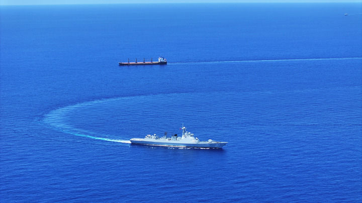 中國(guó)海軍第46批護(hù)航編隊(duì)焦作艦(下)護(hù)送貨船至解護(hù)點(diǎn)后與之分航(2024年5月7日攝)。新華社發(fā)(張大禹 攝)