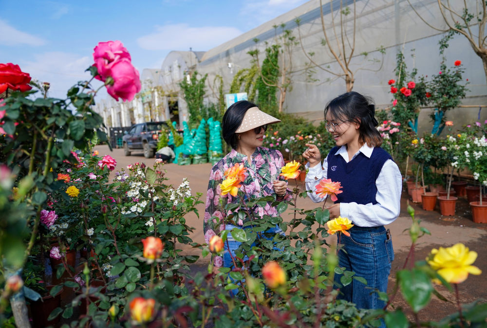 2025年4月11日,越南花商阮翠云(左)與翻譯李青歌在云南昆明斗南一花卉基地內查看鮮花品質。2018年,阮翠云開始在越南銷售云南花卉,讓七彩“云花”成為眾多越南家庭的“??汀?。借助高效的電商平臺和快捷的物流網絡,鮮花從云南花田到河內貨架實現了“次日達”。