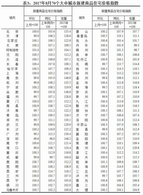2017年8月70個(gè)大中城市新建商品住宅價(jià)格指數(shù)。來(lái)源:國(guó)家統(tǒng)計(jì)局