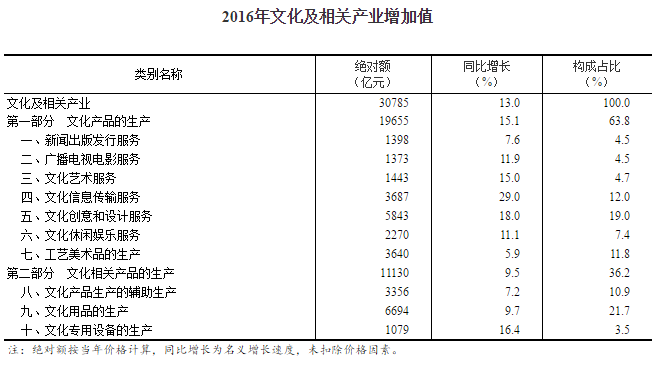 數(shù)據(jù)顯示,根據(jù)《文化及相關(guān)產(chǎn)業(yè)分類(lèi)(2012)》和《文化及相關(guān)產(chǎn)業(yè)增加值核算方法》的規(guī)定和要求,經(jīng)核算,2016年全國(guó)文化及相關(guān)產(chǎn)業(yè)增加值為30785億元,比上年增長(zhǎng)13.0%(未扣除價(jià)格因素,下同),比同期GDP名義增速高4.4個(gè)百分點(diǎn);占GDP的比重為4.14%,比上年提高0.17個(gè)百分點(diǎn)。2016年文化及相關(guān)產(chǎn)業(yè)保持平穩(wěn)快速增長(zhǎng),比重穩(wěn)步上升,對(duì)促進(jìn)經(jīng)濟(jì)轉(zhuǎn)型升級(jí)、平穩(wěn)健康可持續(xù)發(fā)展發(fā)揮了重要作用。