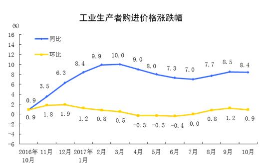人民網(wǎng)北京11月9日電(李楠樺)國家統(tǒng)計局官方網(wǎng)站公布數(shù)據(jù)顯示,2017年10月份,全國工業(yè)生產(chǎn)者出廠價格同比上漲6.9%,環(huán)比上漲0.7%。工業(yè)生產(chǎn)者購進(jìn)價格同比上漲8.4%,環(huán)比上漲0.9%。1-10月平均,工業(yè)生產(chǎn)者出廠價格同比上漲6.5%,工業(yè)生產(chǎn)者購進(jìn)價格同比上漲8.4%。