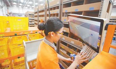 圖為11月12日,在菜鳥網(wǎng)絡(luò)廣東惠陽超級機器人倉,工作人員正在操縱機器人分揀線。以往一個揀貨員一天走六七萬步只能揀貨1000多件,在機器人的幫助下,一個揀貨員一天只走兩三千步,揀貨數(shù)量卻是原來的3倍多。 |