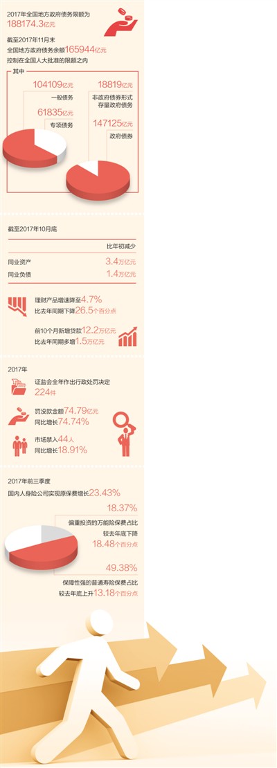 防風(fēng)險(xiǎn)大幕開啟于2017年。這一年,監(jiān)管部門專項(xiàng)整治市場(chǎng)亂象,彌補(bǔ)制度短板,引導(dǎo)金融機(jī)構(gòu)回歸本源,專注主業(yè),增強(qiáng)服務(wù)實(shí)體經(jīng)濟(jì)能力。2018年金融防風(fēng)險(xiǎn)將在哪些重點(diǎn)領(lǐng)域出手?投資者和企業(yè)等市場(chǎng)主體如何看待防風(fēng)險(xiǎn)?怎樣建立防風(fēng)險(xiǎn)的長(zhǎng)效機(jī)制,從根源上遏制風(fēng)險(xiǎn)產(chǎn)生的苗頭?我們從銀行業(yè)、資本市場(chǎng)、保險(xiǎn)業(yè)和地方融資平臺(tái)四個(gè)領(lǐng)域,聚焦2017年防風(fēng)險(xiǎn)的主要成效,反映企業(yè)、投資者、金融機(jī)構(gòu)的實(shí)際感受和來(lái)年期盼,共同探討構(gòu)筑今年金融業(yè)防風(fēng)險(xiǎn)屏障的有效路徑。