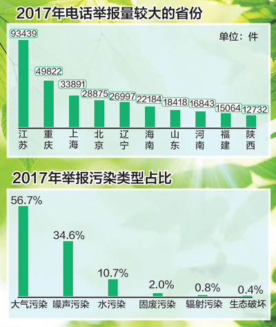 本報(bào)北京1月23日電 (記者孫秀艷)環(huán)境保護(hù)部1月23日發(fā)布通報(bào):2017年,全國(guó)環(huán)保舉報(bào)管理平臺(tái)共接到環(huán)保舉報(bào)61.89萬(wàn)件,其中“12369”環(huán)保舉報(bào)熱線電話41萬(wàn)件,約占66.2%,微信舉報(bào)近13萬(wàn)件,約占20.9%,網(wǎng)上舉報(bào)79885件,約占12.9%。目前已辦結(jié)近59萬(wàn)件,其余2.9萬(wàn)件正在辦理中,環(huán)保舉報(bào)辦結(jié)率達(dá)95%。