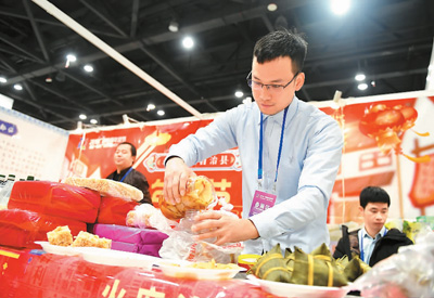 | 廣西電商年貨節(jié)日前在南寧舉行。圖為一名參展商準(zhǔn)備將產(chǎn)品給顧客品嘗。 |