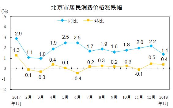 人民網(wǎng)北京2月13日電 據(jù)北京市統(tǒng)計局網(wǎng)站消息,國家統(tǒng)計局北京調(diào)查總隊、北京市統(tǒng)計局日前公布2018年1月份北京市居民消費價格變動情況。2018年1月份,北京市居民消費價格總水平同比上漲1.4%。其中,食品價格下降1.5%,非食品價格上漲2.0%;消費品價格下降0.2%,服務(wù)價格上漲3.7%。