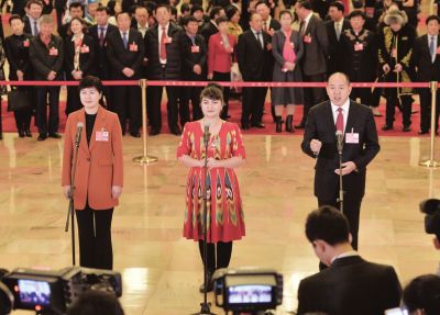 3月20日8:05-8:45(大會閉幕會前)在人民大會堂中央大廳北側(cè)舉辦第五場“代表通道”集中采訪活動,邀請9名全國人大代表接受采訪。圖為全國人大代表張全收(右)、如克亞木·麥提賽地(中)、馬恒燕(左)在回答記者提問。本報記者戴軍攝