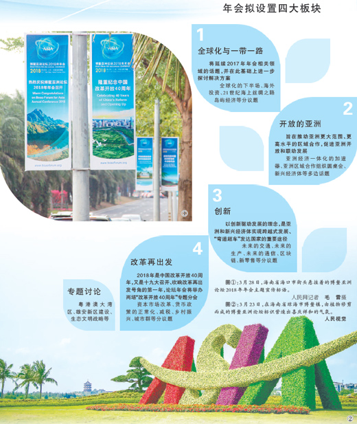 博鰲亞洲論壇2018年年會將于4月8日至11日舉行,主題為“開放創(chuàng)新的亞洲 繁榮發(fā)展的世界”。年會將聚焦改革、開放、創(chuàng)新以及全球化和“一帶一路”等議題,為亞洲的進一步開放、聯(lián)動、創(chuàng)新發(fā)展建言獻策,為世界經(jīng)濟穩(wěn)步復(fù)蘇凝心聚力