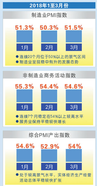 今年以來,面對錯綜復(fù)雜的國際國內(nèi)環(huán)境,各地區(qū)各部門認(rèn)真貫徹黨中央決策部署,堅持穩(wěn)中求進(jìn)工作總基調(diào),不斷深化改革開放,有效激發(fā)內(nèi)生動力和活力。從作為先行指標(biāo)的1—3月份采購經(jīng)理指數(shù)看,中國經(jīng)濟(jì)延續(xù)了去年以來穩(wěn)中向好發(fā)展態(tài)勢,發(fā)展預(yù)期穩(wěn)定向好。