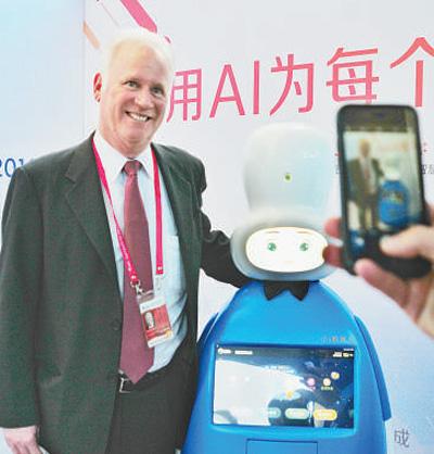 | 4月9日,清潔能源論壇首席執(zhí)行官薄銳思在體驗(yàn)互動后與小i機(jī)器人合影。 |