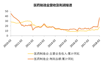 來(lái)到2018年一季度前兩月,行業(yè)加速改善態(tài)勢(shì)更為明顯。醫(yī)藥制造業(yè)主營(yíng)業(yè)務(wù)收入同比增長(zhǎng)18.3%,利潤(rùn)總額累計(jì)值同比增長(zhǎng)37.3%,遠(yuǎn)超去年同期,劉可認(rèn)為,這表明行業(yè)整體環(huán)境在持續(xù)有效改善。