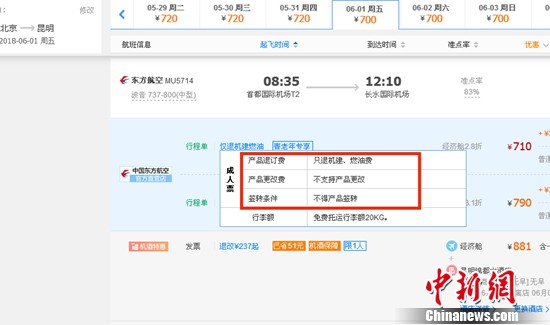 記者在攜程網(wǎng)上預(yù)訂6月1日北京到昆明的東方航空MU5714票價為710元(2.8折),顯示“只退機建、燃油費”“不支持產(chǎn)品更改”。