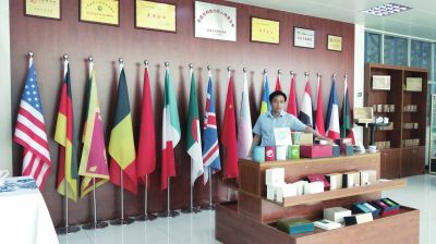 總經(jīng)理袁利人在產(chǎn)品展示廳介紹海外市場情況。